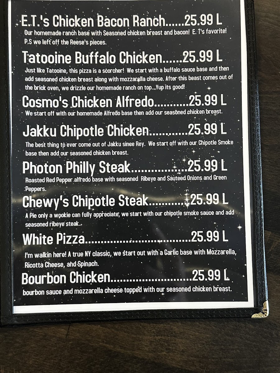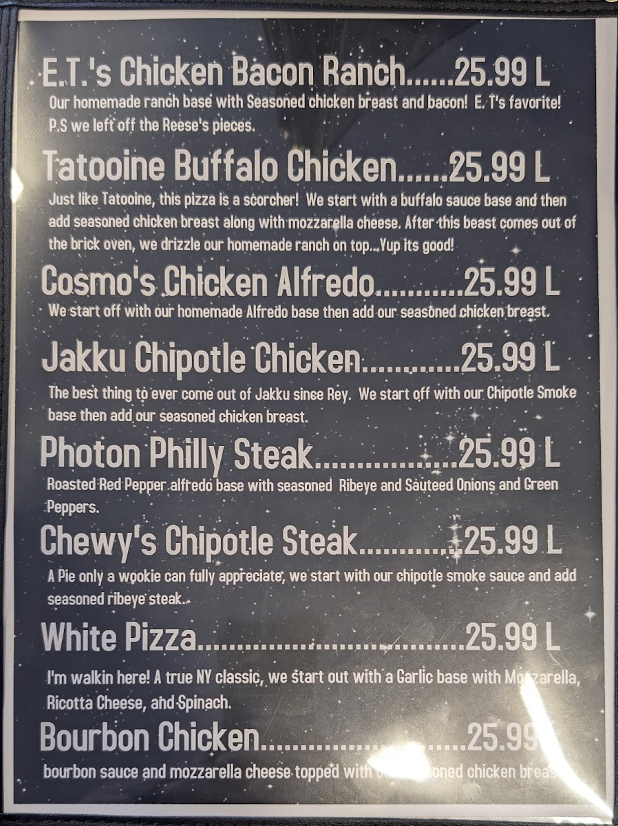 ???? Betelgeuse BBQ Chicken Pizza No, not Beetlejuice — we’re talking about the blazing star in Orion! We launch this cosmic creation with a smoky BBQ sauce base, pile on tender seasoned chicken, and blanket it in melty mozzarella cheese. One bite and your taste buds will be shining as bright as a supergiant!