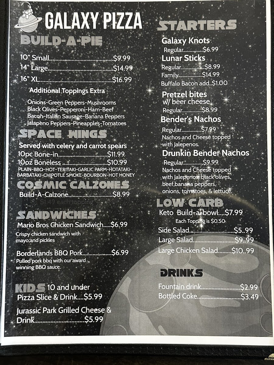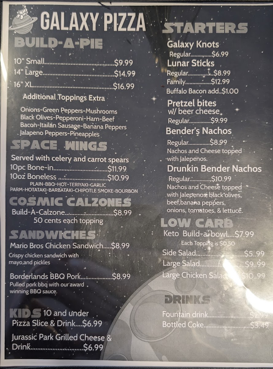 At Galaxy Pizza Arcade Menu, there's something to satisfy every craving. Nestled in the heart of Kingsport, Tennessee, this spot is all about combining delicious food with a fun, lively atmosphere. You’ll find a wide range of mouth-watering pizzas, from classic Margherita to creative specialty pies packed with fresh, flavorful toppings. Whether you're in the mood for a hearty slice or something a little lighter, the menu is designed to give you plenty of tasty choices.