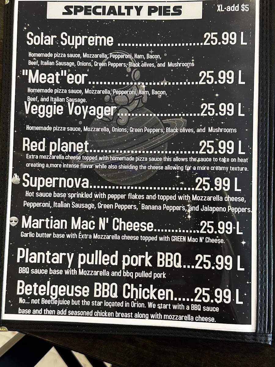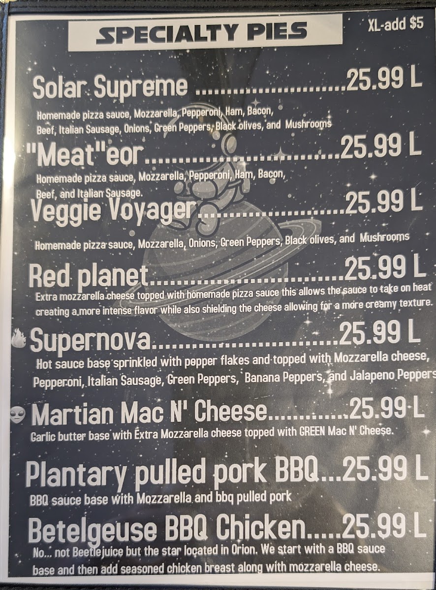 ???? The Solar Supreme The brightest star in our pizza galaxy! A cosmic combo of pepperoni, ham, Italian sausage, green peppers, onions, mushrooms, and black olives all orbiting around a molten core of tomato sauce and mozzarella. One slice and you’ll feel the flavor rays all the way to Pluto! and mozzarella. One slice and you’ll feel the flavor rays all the way to Pluto!